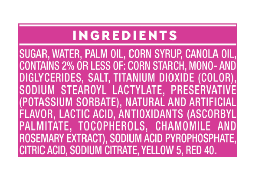 Sugar, Water, Palm Oil, Corn Syrup, Canola Oil, Contains less than 2% of: Corn Starch, Mono- and Diglycerides, Salt, Titanium Dioxide (Color), Potassium Sorbate (Preservative), Antixoidants (Tocopherols and Ascorbyl Palmitate, Chamomile Extract, Rosemary Extract), Sodium Stearoyl Lactylate, Sodium Acid Pyrophosphate, Sodium Citrate, Citric Acid, Natural and Artificial Flavor, Lactic Acid, Yellow 5, Red 40.