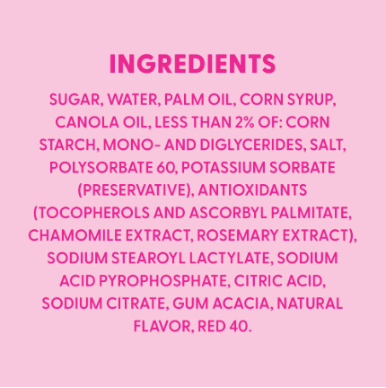 Sugar, Water, Palm Oil, Corn Syrup, Canola Oil, Less than 2% of: Corn Starch, Mono- and Diglycerides, Salt, Polysorbate 60, Potassium Sorbate (Preservative), Antioxidants (Tocopherols and Ascorbyl Palmitate, Chamomile Extract, Rosemary Extract), Sodium Stearoyl Lactylate, Sodium Acid Pyrophosphate, Citric Acid, Sodium Citrate, Gum Acacia, Natural Flavor, Red 40