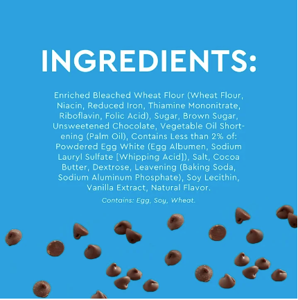 Enriched Bleached Wheat Flour (Wheat Flour, Niacin, Reduced Iron, Thiamine Mononitrate, Riboflavin, Folic Acid), Sugar, Brown Sugar, Unsweetened Chocolate, Vegetable Oil Shortening (Palm Oil), Contains less than 2% of: Powdered Egg White (Egg Albumen, Sodium Lauryl Sulfate [Whipping Aid]), Salt, Cocoa Butter, Dextrose, Leavening (Baking Soda, Sodium Aluminum Phosphate), Soy Lecithin, Vanilla Extract, Natural Flavor. CONTAINS: EGG, SOY, WHEAT.