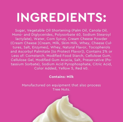 Sugar, Water, Palm Oil, Corn Syrup, Canola Oil, Contains less than 2% of: Mono- and Diglycerides, Modified Corn Starch, Cellulose Gum, Cellulose Gel, Modified Gum Acacia, Salt, Polysorbate 60, Potassium Sorbate (Preservative), Sodium Stearoyl Lactylate, Tocopherols and Ascorbyl Palmitate (Antioxidants), Sodium Acid Pyrophosphate, Citric Acid, Titanium Dioxide (Color), Natural and Artificial Flavor, Lactic Acid, Yellow 5, Red 40