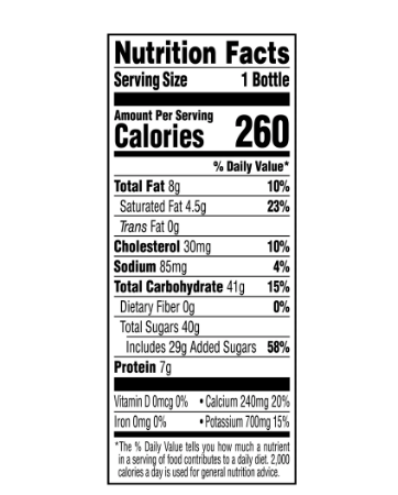 Coffee (Water, Coffee), Skim Milk, Cane Sugar, Cream, Less than 2% of: Natural Flavors, Potassium Carbonate, Potassium Phosphate, Ascorbic Acid (to Protect Color), Gellan Gum, Carrageenan.