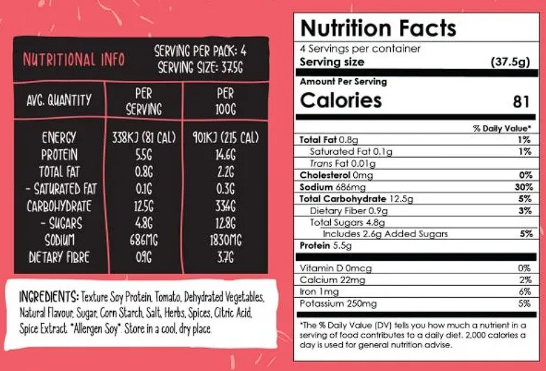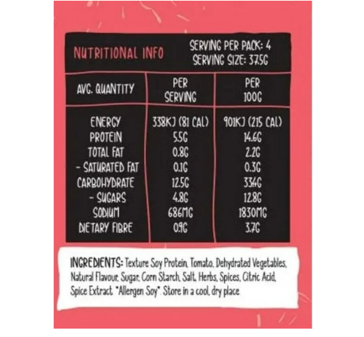 Texture Soy Protein, Tomato, Dehydrated Vegetables, Natural Flavor, Sugar, Corn Starch, Salt, Herbs, Spices, Citric Acid, Spice Extract