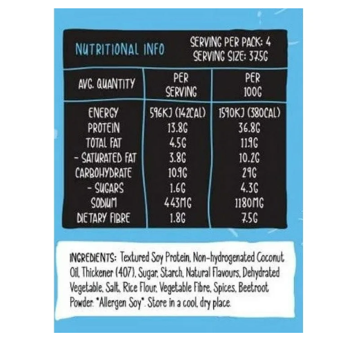 Textured Soy Protein, Non-hydrogenated Coconut Oil, Thickener (407), Sugar, Starch, Natural Flavors, Dehydrated Vegetable, Salt, Rice Flour, Vegetable Fiber, Spices, Beetroot Powder