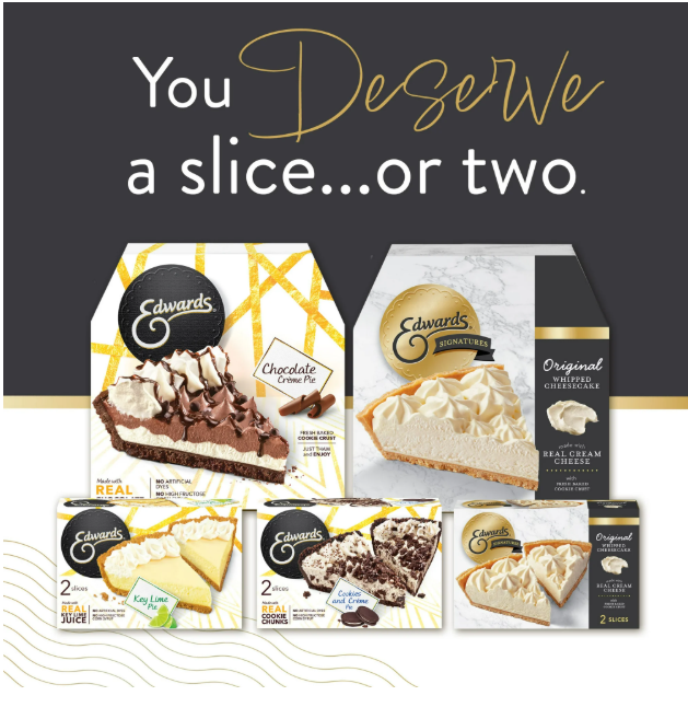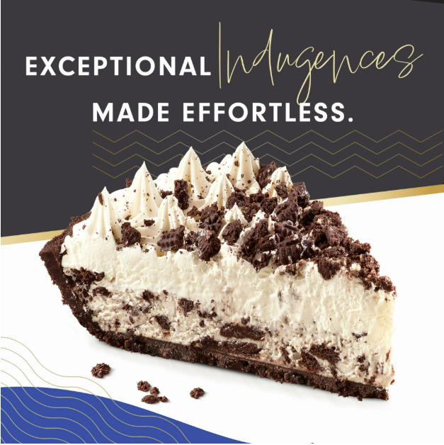 EDWARDS DESSERTS - Exceptional indulgences made effortless! No matter how you slice our decadent, velvety layers and fresh-from-the-oven cookie crumb crust, our frozen pies are meticulously whipped, sprinkled, and drizzled to extravagant perfection. The Edwards Cookies & Crème Pie is filled with a luscious layer of fluffy vanilla crème and chocolate cookie crumbles and is topped with whipped crème rosettes and a cookie crumb garnish. Simply thaw and serve to see how this crème pie will be the talk of the dessert table for every occasion and holiday.
