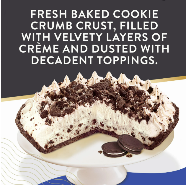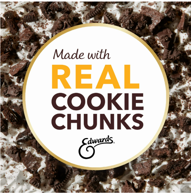 EDWARDS COOKIES & CRÈME PIE is made on a freshly baked cookie crumb crust with a luscious layer of fluffy vanilla crème and chocolate cookie crumbles and is topped with whipped crème rosettes and a cookie crumb garnish
