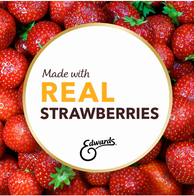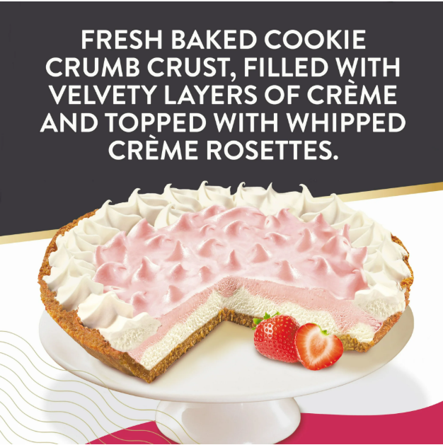 EDWARDS STRAWBERRY CRÈME PIE is made on a freshly baked cookie crumb crust with luscious layers of strawberry and vanilla crème filling and is topped with whipped crème rosettes