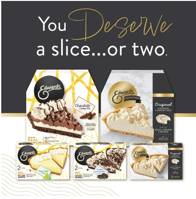 EDWARDS DESSERTS - Exceptional indulgences made effortless! No matter how you slice our decadent, velvety layers and fresh-from-the-oven cookie crumb crust, our frozen pies are meticulously whipped, sprinkled, and drizzled to extravagant perfection. The Edwards Strawberry Crème Pie is filled with luscious layers of strawberry and vanilla crème filling and is topped with whipped crème rosettes. Simply thaw and serve to see how this crème pie will be the talk of the dessert table for every occasion and holiday.