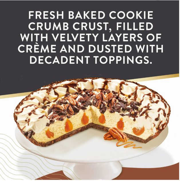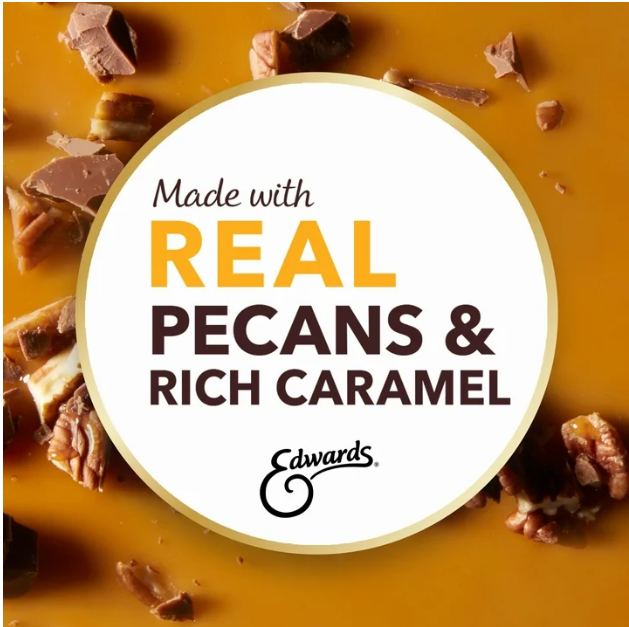 EDWARDS TURTLE PIE is made on a freshly baked cookie crumb crust with a smooth caramel filling that is infused with even more caramel and is topped with a chocolate drizzle, pecans, and whipped creme rosettes