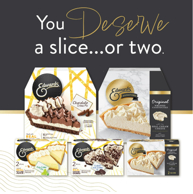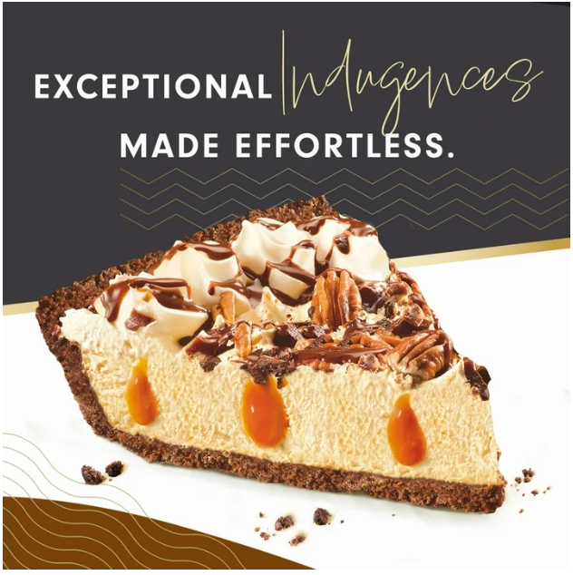 EDWARDS DESSERTS - Exceptional indulgences made effortless! No matter how you slice our decadent, velvety layers and fresh-from-the-oven cookie crumb crust, our frozen pies are meticulously whipped, sprinkled, and drizzled to extravagant perfection. The Edwards Turtle Pie is filled with a smooth caramel filling that is infused with even more rich caramel and is topped with chocolate drizzle, pecans, and whipped creme rosettes. Simply thaw and serve to see how this pie will be the talk of the dessert table for every occasion and holiday.