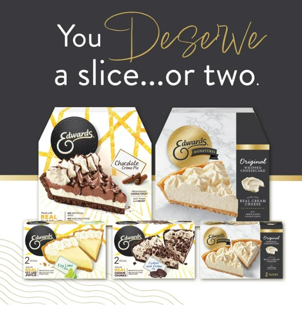 EDWARDS DESSERTS - Exceptional indulgences made effortless! Our smooth, decadent frozen pies are meticulously whipped, sprinkled, and drizzled to extravagant perfection. All you have to do is relax and treat yourself to the rich flavor, velvety crème layers, and fresh-from-the-oven cookie crumb crust. Our two slices of Edwards Key Lime Pie are layered with smooth, lime filling made from real Key West Lime juice, and beautifully topped with whipped crème rosettes. Simply thaw and enjoy a slice or two!