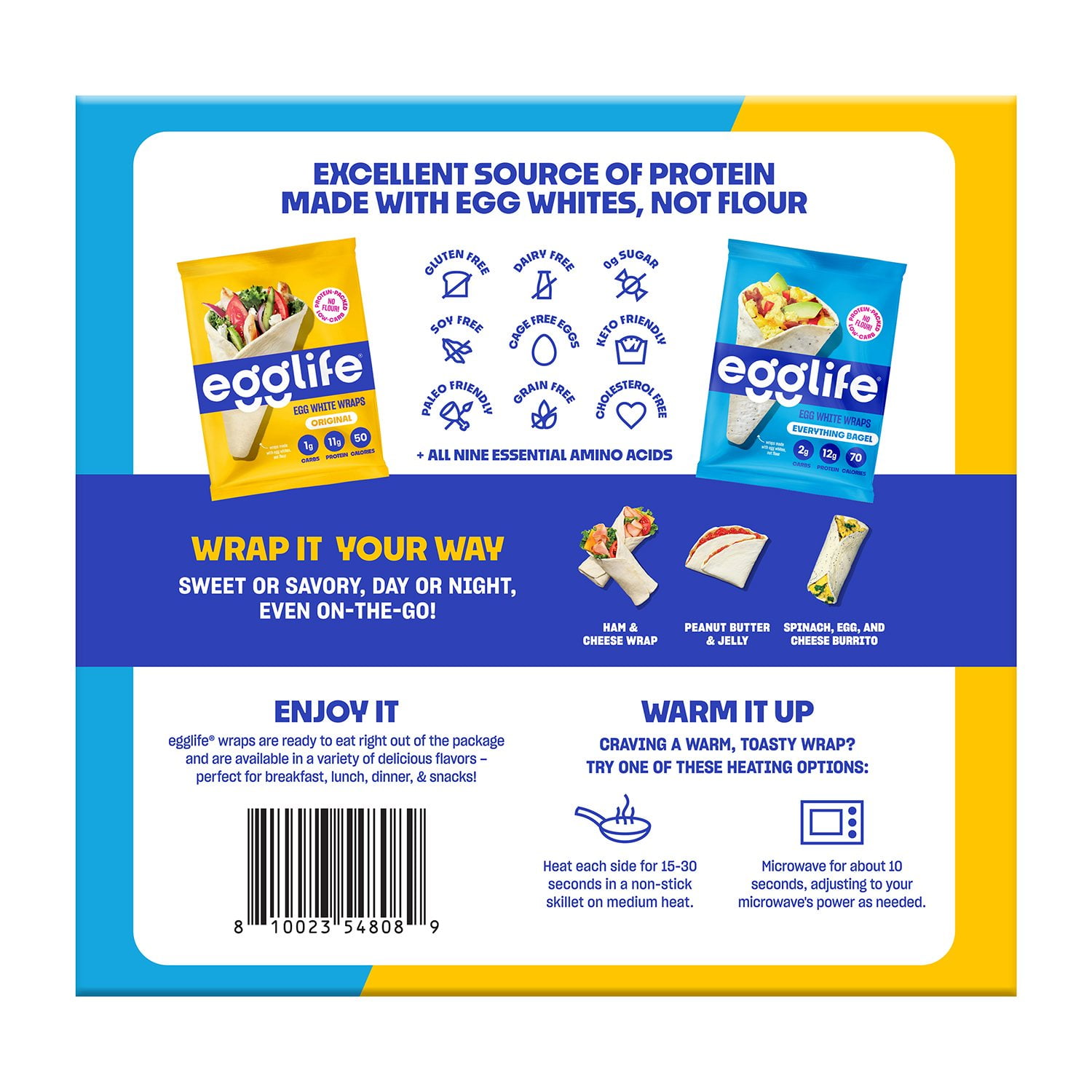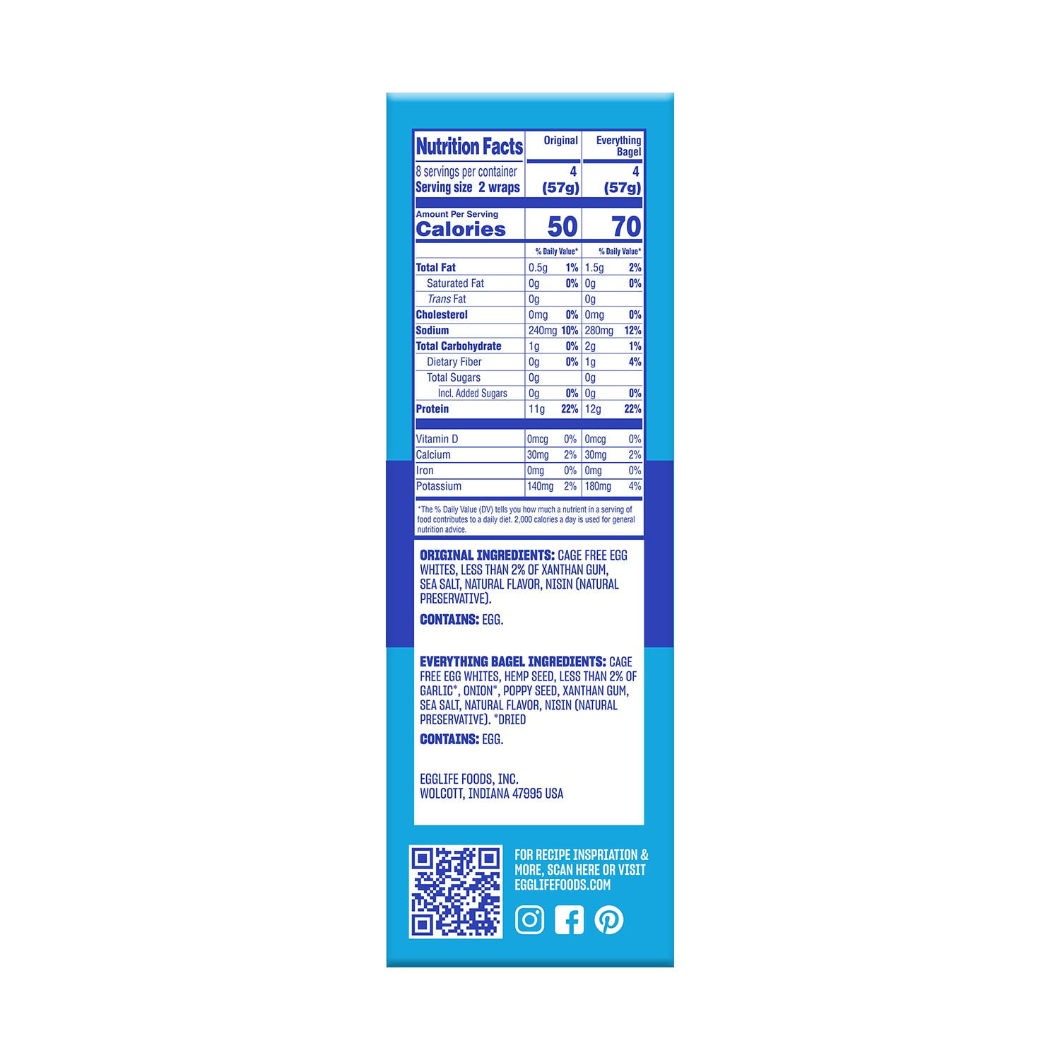 This package includes two varieties to suit your taste: 1 pack of 8 original egg white wraps and 1 pack of 8 everything bagel egg white wraps. Whether you prefer a classic flavor or a savory twist, these wraps are sure to satisfy.