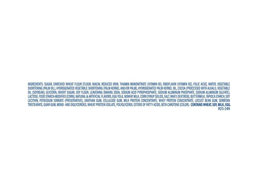 Sugar, Enriched Wheat Flour [Flour, Niacin, Reduced Iron, Thiamin Mononitrate (Vitamin B1), Riboflavin (Vitamin B2), Folic Acid], Vegetable Shortening (Palm Oil), Water, Hydrogenated Palm Kernel Oil, Cocoa (Processed With Alkali), Vegetable Oil (Soybean), Glycerin, Invert Sugar, Soy Flour, Leavening [Baking Soda, Sodium Acid Pyrophosphate, Sodium Aluminum Phosphate, Monocalcium Phosphate, Aluminum Sulfate], Food Starch Modified (Corn), Natural & Artificial Flavors, Egg Yolk, Nonfat Milk, Corn Syrup Solids, Salt, Dextrose, Whey, Buttermilk, Potassium Sorbate (Preservative), Xanthan Gum, Cellulose Gum, Milk Protein Concentrate, Whey Protein Concentrate, Carob Bean Gum, Tapioca Starch, Guar Gum, Soy Lecithin, Mono- And Diglycerides, Polyglycerol Esters Of Fatty Acids, Wheat Protein Isolate, Beta Carotene (Color).