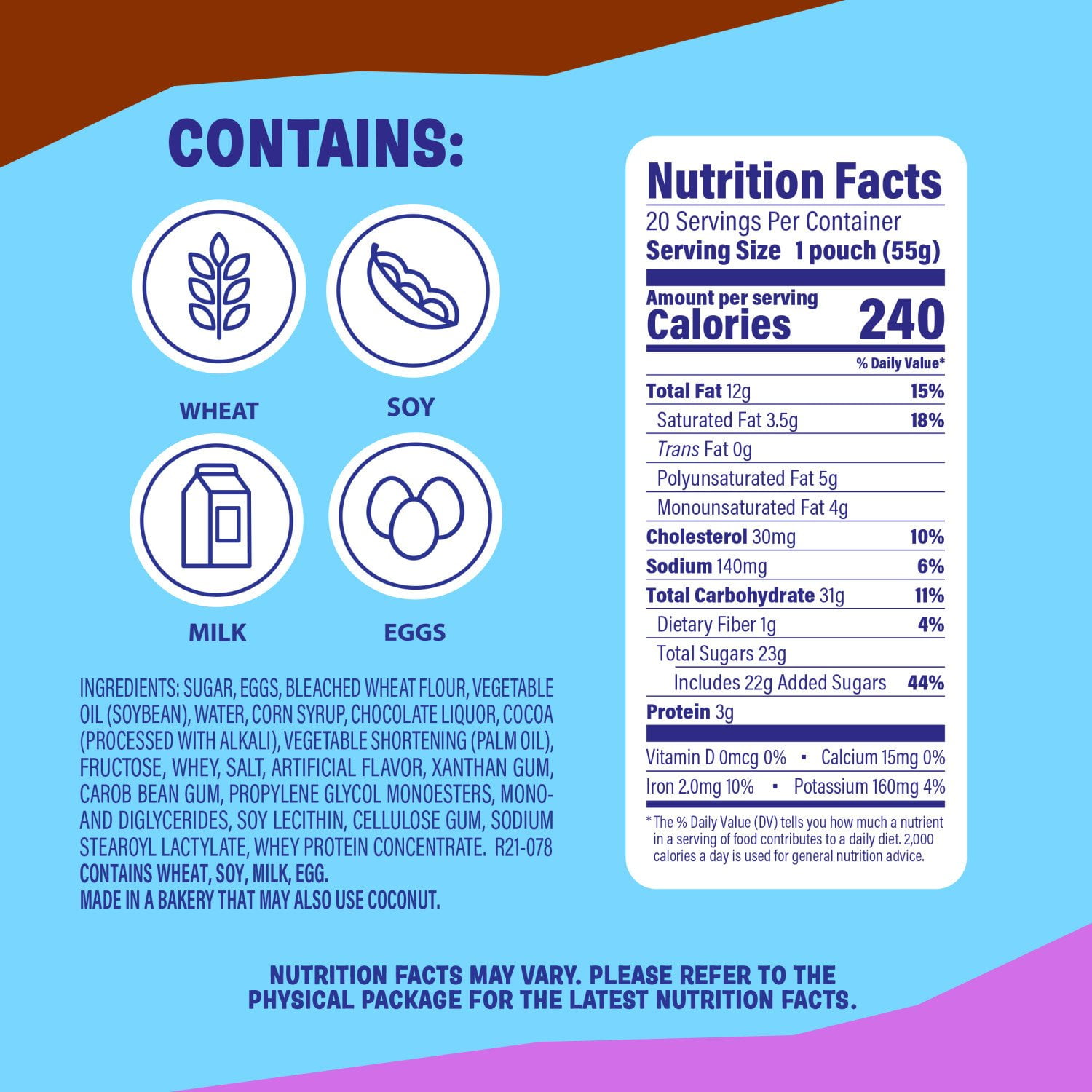 Ingredients: Sugar, Eggs, Bleached Wheat Flour, Soybean Oil, Water, Corn Syrup, Chocolate Liquor, Cocoa (Processed With Alkali), Palm Oil, Fructose, Whey, Salt, Artificial Flavor, Carob Bean Gum, Xanthan Gum, Propylene Glycol Monoesters, Mono- And Diglycerides, Soy Lecithin, Cellulose Gum, Sodium Stearoyl Lactylate, Whey Protein Concentrate.