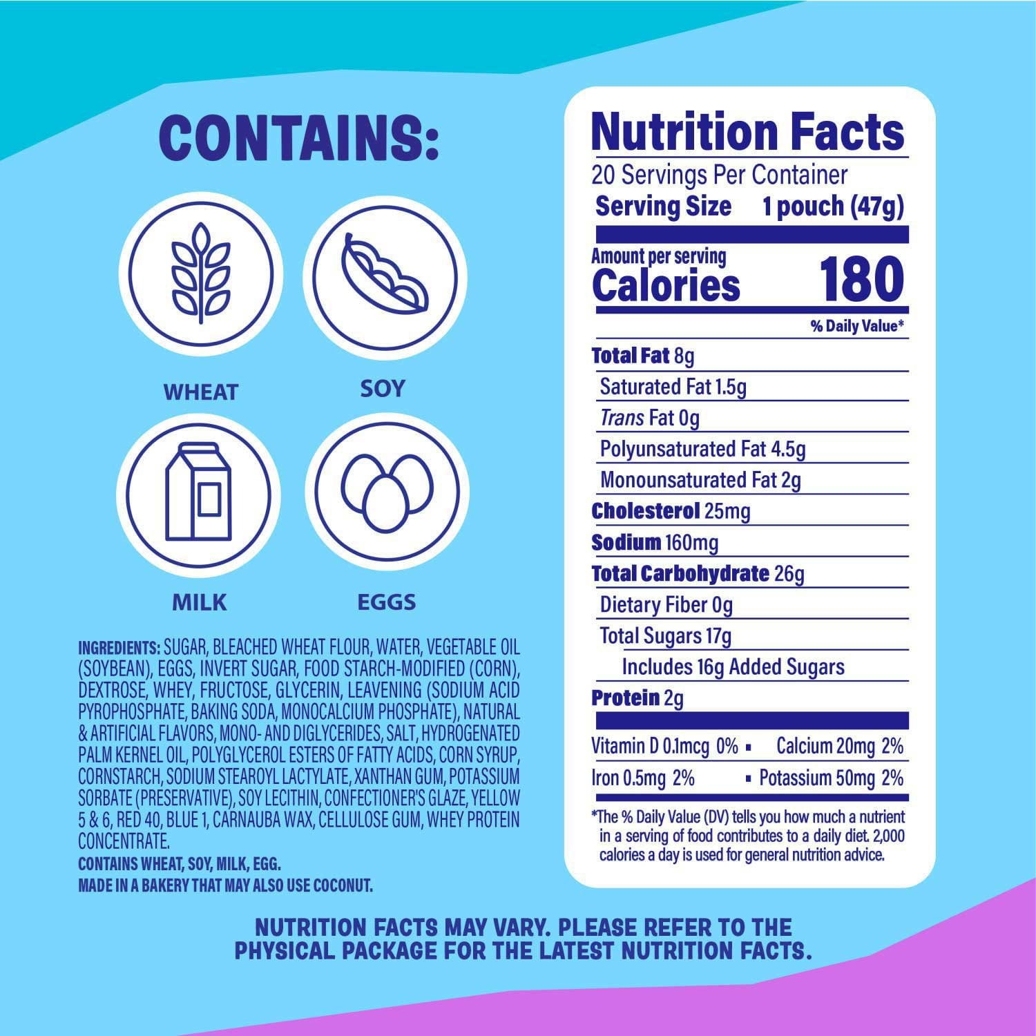 Ingredients: Sugar, Bleached Wheat Flour, Water, Vegetable Oil (Soybean), Eggs, Invert Sugar, Food Starch-Modified (Corn), Whey, Glycerin, Mono- And Diglycerides, Leavening (Sodium Acid Pyrophosphate, Baking Soda, Cornstarch, Natural Hydrogenated Palm Kernel Oil, Corn Syrup, Cornstarch, Xanthan Gum, Soy Lecithin, Sodium Stearoyl Lactylate, Potassium (Preservative), Glaze, Whey Protein Concentrate, Red 40, Yellow 5 & 6, Cellulose Gum, Carnauba Wax, Wheat Starch, Red 3, Blue 1. Contains wheat, soy, milk, egg. Made in a bakery that may also use coconut.