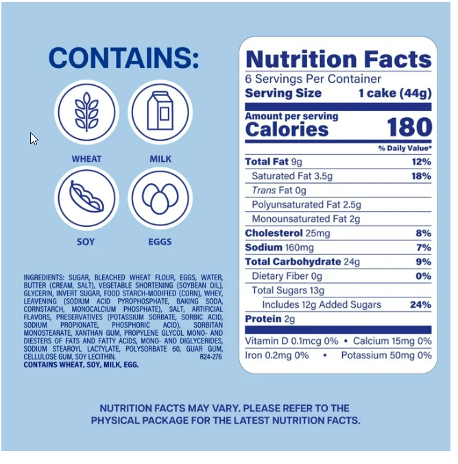 Sugar, Bleached Wheat Flour, Eggs, Water, Butter [Cream, Salt], Vegetable Shortening (Soybean Oil), Glycerin, Invert Sugar, Food Starch-Modified (Corn), Whey, Leavening [Sodium Acid Pyrophosphate, Baking Soda, Cornstarch, Monocalcium Phosphate], Salt, Artificial Flavors, Preservatives [Potassium Sorbate, Sorbic Acid, Sodium Propionate, Phosphoric Acid], Sorbitan Monostearate, Xanthan Gum, Propylene Glycol, Mono- And Diesters Of Fats And Fatty Acids, Mono- And Diglycerides, Sodium Stearoyl Lactylate, Polysorbate 60, Guar Gum, Cellulose Gum, Soy Lecithin.