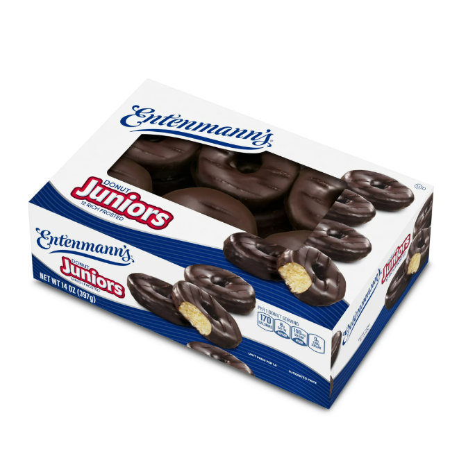 One package with Entenmann’s Rich Frosted Donut Juniors, 14 oz box.