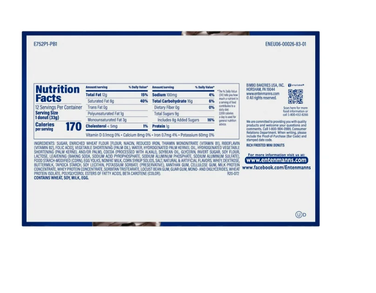 Indulge in the delectable taste and delightful tradition of Entenmann’s Rich Frosted Donut Juniors. Entenmann's most popular donut in a moist, golden cake donut enrobed in rich frosting for mouthwatering deliciousness and a mid-size that is perfect for on-the-go snacking. These chocolatey-covered donuts never fail to make your morning coffee or afternoon tea better. Entenmann’s baked goods are always made with care and quality ingredients for a delicious taste you can count on. Whether you enjoy them as a breakfast food, part of brunch, as a midday snack or dessert, Entenmann’s donuts are kosher, allowing everyone to enjoy a spontaneous sprinkle of delight whenever they need one. Entenmann’s cakes, coffee cakes, donuts and pastries help families celebrate special occasions and the everyday with heritage baked goods. Celebrate the moment with Entenmann’s Rich Frosted Donuts. Everyone’s got a favorite. What’s yours?