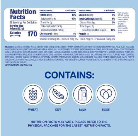 Sugar, Enriched Wheat Flour [Flour, Niacin, Reduced Iron, Thiamin Mononitrate (Vitamin B1), Riboflavin (Vitamin B2), Folic Acid], Vegetable Shortening (Palm Oil), Water, Hydrogenated Palm Kernel Oil, Hydrogenated Vegetable Shortening (Palm Kernel And/Or Palm), Cocoa (Processed With Alkali), Soybean Oil, Glycerin, Invert Sugar, Soy Flour, Lactose, Leavening [Baking Soda, Sodium Acid Pyrophosphate, Sodium Aluminum Phosphate, Sodium Aluminum Sulfate], Food Starch-Modified (Corn), Egg Yolks, Nonfat Milk, Corn Syrup Solids, Salt, Natural & Artificial Flavors, Whey, Dextrose, Buttermilk, Tapioca Starch, Soy Lecithin, Potassium Sorbate (Preservative), Xanthan Gum, Cellulose Gum, Milk Protein Concentrate, Whey Protein Concentrate, Sorbitan Tristearate, Locust Bean Gum, Guar Gum, Mono- And Diglycerides, Wheat Protein Isolate, Polyglycerol Esters Of Fatty Acids, Beta Carotene (Color).