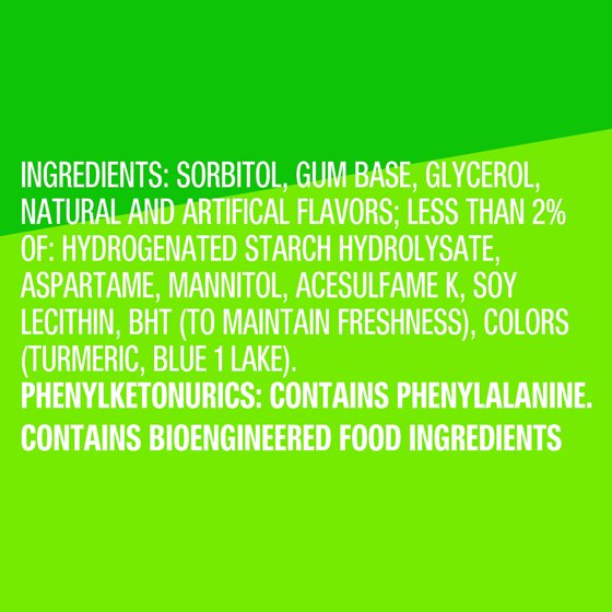 SORBITOL, GUM BASE, GLYCEROL, NATURAL AND ARTIFICIAL FLAVORS; LESS THAN 2% OF: HYDROGENATED STARCH HYDROLYSATE, ASPARTAME, MANNITOL, ACESULFAME K, SOY LECITHIN, BHT (TO MAINTAIN FRESHNESS), COLORS (TURMERIC, BLUE 1 LAKE).