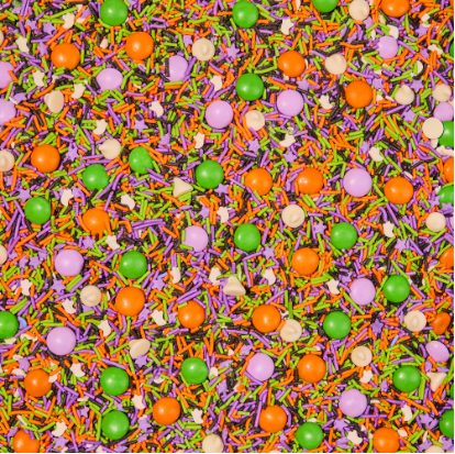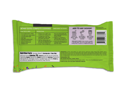 COLOR AND CRUNCH: The explosion of color and satisfying crunch sets Baking Confetti apart from other baking ingredients; Halloween Baking Confetti is a party in a bag; With a Halloween-y color combo of orange, green, and purple, and ghost pieces that keep their shape when baked, anything you create will be scary good