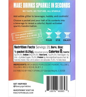 Stay mysterious. Conveniently packaged in a sleek portable carton, FANCY SPRINKLES® Mystery Fancy Edible Glitter Packets include 10 single-use edible glitter packets in five mystery colors, but you won't know what color until you add liquid! This edible glitter for drinks is perfect for adding instant glamour to your celebrations, dressing up your bar cart, gifting to family and friends, and simply transforming your cocktail recipes. Create and serve up to 20 glittering beverages for parties or on the go, wherever the moment strikes!