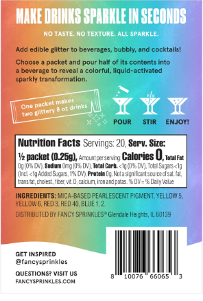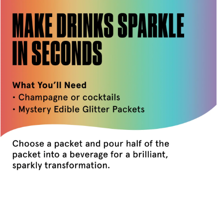 Stay mysterious. Conveniently packaged in a sleek portable carton, FANCY SPRINKLES® Mystery Fancy Edible Glitter Packets include 10 single-use edible glitter packets in five mystery colors, but you won't know what color until you add liquid! This edible glitter for drinks is perfect for adding instant glamour to your celebrations, dressing up your bar cart, gifting to family and friends, and simply transforming your cocktail recipes. Create and serve up to 20 glittering beverages for parties or on the go, wherever the moment strikes!