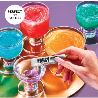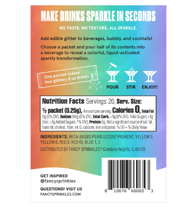 Stay mysterious. Conveniently packaged in a sleek portable carton, FANCY SPRINKLES® Mystery Fancy Edible Glitter Packets include 10 single-use edible glitter packets in five mystery colors, but you won't know what color until you add liquid! This edible glitter for drinks is perfect for adding instant glamour to your celebrations, dressing up your bar cart, gifting to family and friends, and simply transforming your cocktail recipes. Create and serve up to 20 glittering beverages for parties or on the go, wherever the moment strikes!