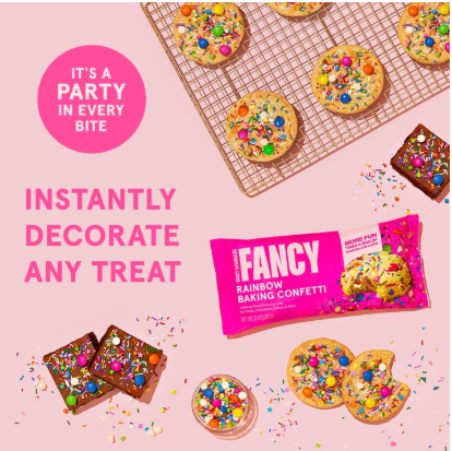 It's a party in every bite! Our FANCY SPRINKLES® Rainbow Baking Confetti brings a vibrant burst of color, texture, and fun to your treats, making every cookie a beautiful creation. Simply roll your cookie dough in Rainbow Baking Confetti and let your cookies steal the spotlight! Featuring a rainbow of our signature FANCY SPRINKLES Crunchy Jimmies®, milk chocolate gems, creamy vanilla chips, and star confetti, this blend is perfect for elevating your desserts and baked goods.