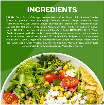 SALAD: Corn, Savoy Cabbage, Hominy (White Corn, Water. Salt. Sodium Bisulfite [added to promote color retention]), Arcadian Lettuce, Grape Tomatoes, Feta (Pasteurized Milk, Salt, Cheese Culture, Enzymes and Potato Starch [Added to Prevent Caking]), Red Cabbage, Tortilla Strips (Corn Masa Flour, Sunflower, Safflower, and/or Canola Oil, Salt). Lime Juice, Red Onion, Jalapeño, Cilantro DRESSING: Greek Yogurt (Grade A pasteurized skim milk, cream, milk protein concentrate, tapioca starch. pectin, enzymes, live active cultures: S. thermophilus, Bulgaricus, L. acidophilus. Bifidus and L. casei). Vegenaise (Expeller-Pressed Canola Oil, Filtered Water. Brown Rice Syrup. Apple Cider Vinegar, Soy Protein, Sea Salt, Mustard Flour, Lemon Juice Concentrate), Lime Juice, Canola Oil, Water, Salt. Paprika