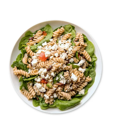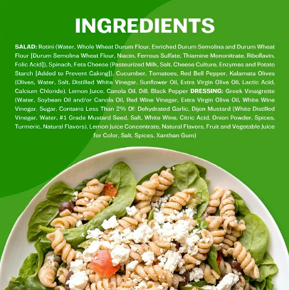 SALAD: Rotini (Water, Whole Wheat Durum Flour, Enriched Durum Semolina and Durum Wheat Flour (Durum Semolina Wheat Flour, Niacin, Ferrous Sulfate, Thiamine Mononitrate, Riboflavin, Folic Acid]), Spinach, Feta Cheese (Pasteurized Milk, Salt, Cheese Culture, Enzymes and Potato Starch Added to Prevent Caking)). Cucumber, Tomatoes, Red Bell Pepper, Kalamata Olives (Olives, Water, Salt, Distilled White Vinegar, Sunflower Oil, Extra Virgin Olive Oil, Lactic Acid, Calcium Chloride), Lemon Juice, Canola Oil, Dill. Black Pepper DRESSING: Greek Vinaigrette (Water, Soybean Oil and/or Canola Oil, Red Wine Vinegar. Extra Virgin Olive Oil, White Wine Vinegar. Sugar, Contains Less Than 2% of: Dehydrated Garlic, Dijon Mustard (White Distilled Vinegar. Water, #1 Grade Mustard Seed, Salt. White Wine. Citric Acid, Onion Powder. Spices. Turmeric, Natural Flavors), Lemon Juice Concentrate, Natural Flavors. Fruit and Vegetable Juice for Color, Salt, Spices, Xanthan Gum)