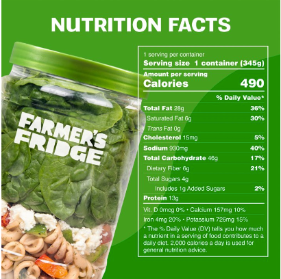 - Fresh Whole Ingredients: Farmer's Fridge products are made fresh and free from unnecessary additives—just real food, real flavor. No artificial preservatives.
