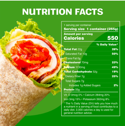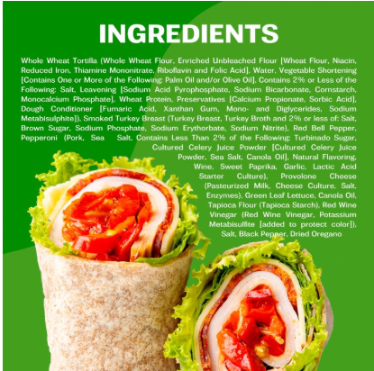 Whole Wheat Tortilla (Whole Wheat Flour, Enriched Unbleached Flour [Wheat Flour, Niacin, Reduced Iron, Thiamine Mononitrate, Riboflavin and Folic Acid], Water, Vegetable Shortening [Contains One or More of the Following: Palm Oil and/or Olive Oil], Contains 2% or Less of the Following: Salt, Leavening [Sodium Acid Pyrophosphate, Sodium Bicarbonate, Cornstarch, Monocalcium Phosphate], Wheat Protein, Preservatives [Calcium Propionate, Sorbic Acid], Dough Conditioner [Fumaric Acid, Xanthan Gum, Mono- and Diglycerides, Sodium Metabisulphite]), Smoked Turkey Breast (Turkey Breast, Turkey Broth and 2% or less of: Salt, Brown Sugar, Sodium Phosphate, Sodium Erythorbate, Sodium Nitrite), Red Bell Pepper, Pepperoni (Pork, Sea Salt, Contains Less Than 2% of the Following: Turbinado Sugar, Cultured Celery Juice Powder [Cultured Celery Juice Powder, Sea Salt, Canola Oil], Natural Flavoring, Wine, Sweet Paprika, Garlic, Lactic Acid Starter Culture), Provolone Cheese (Pasteurized Milk, Cheese Culture, Salt, Enzymes), Green Leaf Lettuce, Canola Oil, Tapioca Flour (Tapioca Starch), Red Wine Vinegar (Red Wine Vinegar, Potassium Metabisulfite [added to protect color]), Salt, Black Pepper, Dried Oregano