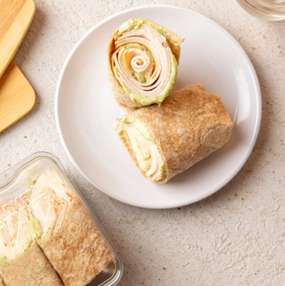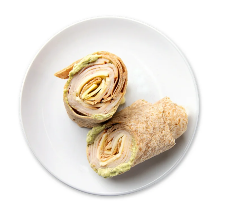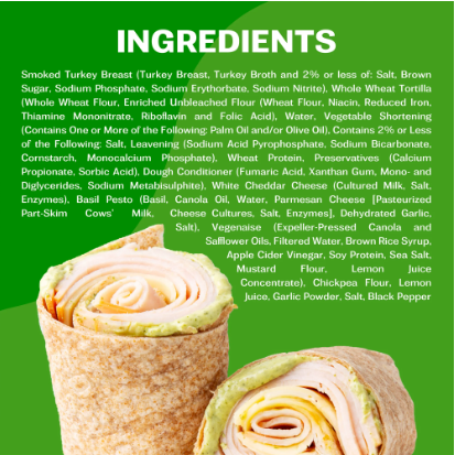 Smoked Turkey Breast (Turkey Breast, Turkey Broth and 2% or less of: Salt, Brown Sugar, Sodium Phosphate, Sodium Erythorbate, Sodium Nitrite), Whole Wheat Tortilla (Whole Wheat Flour, Enriched Unbleached Flour [Wheat Flour, Niacin, Reduced Iron, Thiamine Mononitrate, Riboflavin and Folic Acid], Water, Vegetable Shortening [Contains One or More of the Following: Palm Oil and/or Olive Oil], Contains 2% or Less of the Following: Salt, Leavening [Sodium Acid Pyrophosphate, Sodium Bicarbonate, Cornstarch, Monocalcium Phosphate], Wheat Protein, Preservatives [Calcium Propionate, Sorbic Acid], Dough Conditioner [Fumaric Acid, Xanthan Gum, Mono- and Diglycerides, Sodium Metabisulphite]), White Cheddar Cheese (Cultured Milk, Salt, Enzymes), Basil Pesto (Basil, Canola Oil, Water, Parmesan Cheese [Pasteurized Part-Skim Cows’ Milk, Cheese Cultures, Salt, Enzymes], Dehydrated Garlic, Salt), Vegenaise (Expeller-Pressed Canola and Safflower Oils, Filtered Water, Brown Rice Syrup, Apple Cider Vinegar, Soy Protein, Sea Salt, Mustard Flour, Lemon Juice Concentrate), Chickpea Flour, Lemon Juice, Garlic Powder, Salt, Black Pepper