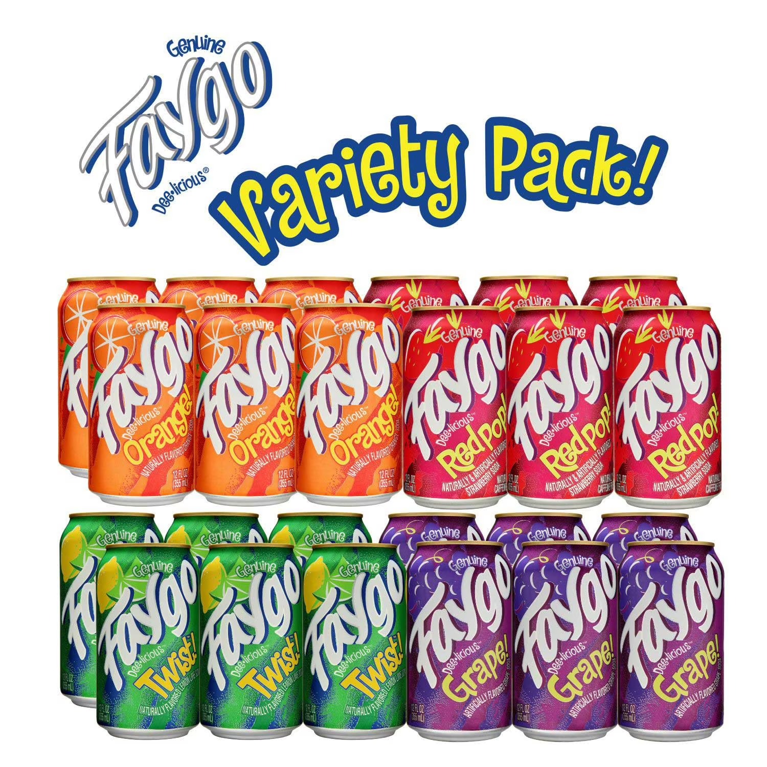 This Faygo Variety includes all of the best Faygo flavors, including redpop, grape soda, twist and Faygo orange soda. There are six cans each of redpop and grape, as well as 12 cans of the orange soda, which is one of the most popular flavors. The multipack makes it easy to get a flavor for everyone and includes plenty to go around.