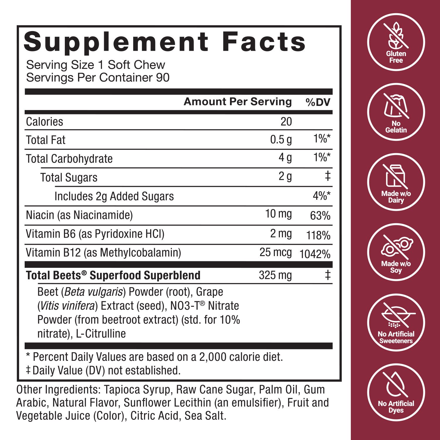 Total Beets® Soft Chews are formulated with the powerful Superfood Superblend of beet root powder, beet root nitrates, grape seed extract, and B vitamins to promote daily heart health and energy metabolism.