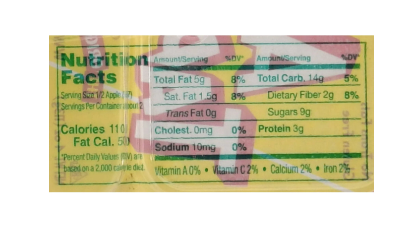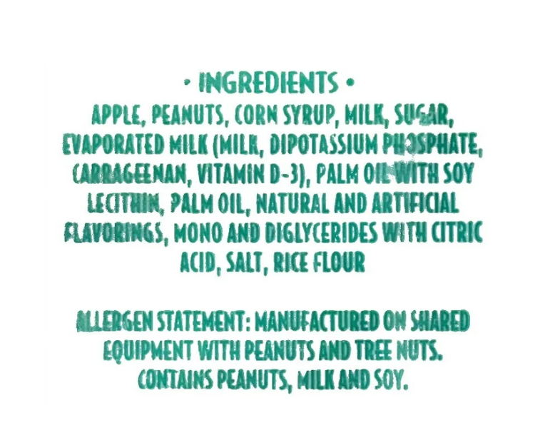 Granny Smith Apple, Peanuts, Granulated Beet Sugar, Corn Syrup, Nonfat Milk, Water, Hydrogenated Soybean Oil, Vegetable Shortening (Partially Hydrogenated Soybean Oil and Cottonseed Oils, Mono & Diglycerides, Polysorbate 60), Flavor (Natural and Artificial Caramel Flavor, Caramel Color, FD&C Red #40), Salt, Flour (Wheat Flour, Malted Barley Flour, Niacin, Reduced Iron, Thiamine Mononitrate, Riboflavin, Folic Acid), Mono & Diglycerides, Baking Soda, Soy Lecithin.Contains: Peanuts, Milk, Soy, Wheat.