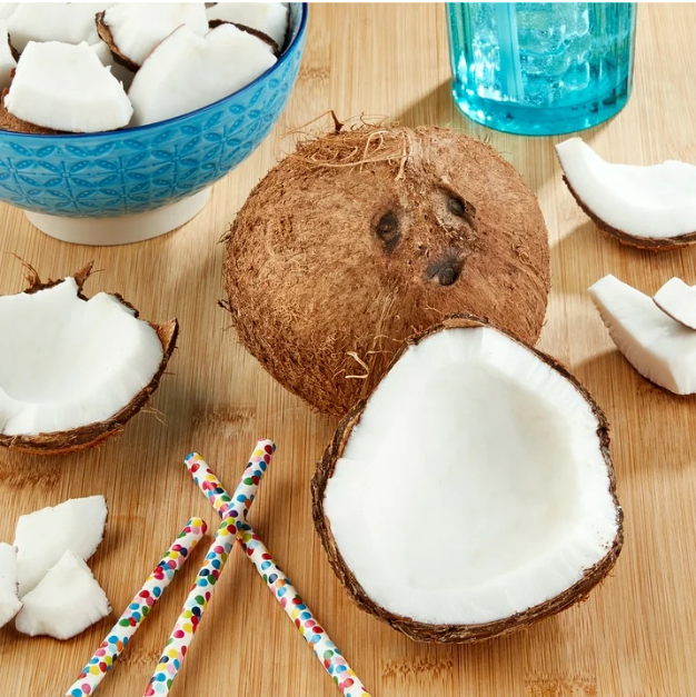 Enjoy a taste of the tropics with a Fresh Coconut. Enjoying a fresh coconut couldn't be easier: just puncture the pre-scored eyes on top with a dull knife and pour out the delicious coconut water. After the water is gone, crack the coconut along the scored line, remove the coconut meat with a dull knife, and enjoy! There are so many ways to enjoy a fresh coconut; you can blend it into smoothies, cut it into chunks and add to stir fries and stews, use it as a garnish, blend it into dips and spreads, or even make your own shredded coconut for delicious desserts. Enjoy a tropical treat any time of year when you bring home a Fresh Coconut.