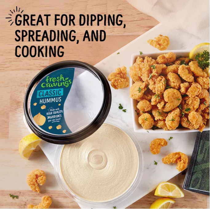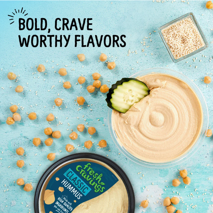 Indulge in Fresh Cravings Classic Hummus, Single 10 oz Tub. This gluten-free, vegan hummus is made with roasted chickpeas, Chilean Extra Virgin Olive Oil, tahini, and spices blended to perfection for a smooth finish. Ideal for snacking, cooking, and sharing with family and friends. Dip into the recyclable plastic tub with your favorite veggies or use as an ingredient in recipes. So good you'll be coming back for more.