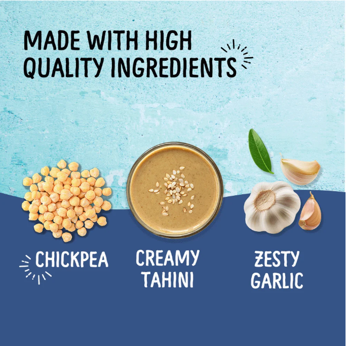 CHICKPEAS, WATER, OIL BLEND (CANOLA OIL, SOYBEAN OIL AND/OR SUNFLOWER OIL, EXTRA VIRGIN OLIVE OIL), TAHINI (GROUND SESAME), SEA SALT, LESS THAN 1% OF: GARLIC, CITRIC ACID, POTASSIUM SORBATE (MAINTAINS FRESHNESS), SODIUM BENZOATE (MAINTAINS FRESHNESS). CONTAINS: SESAME.