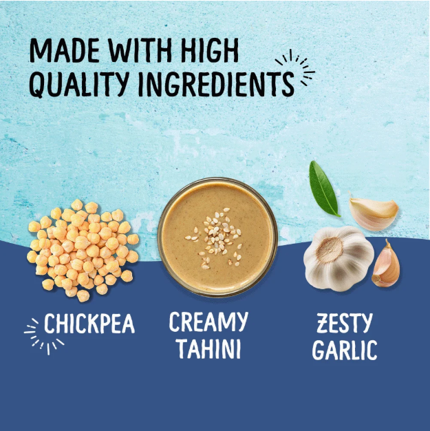 Chickpeas (Water, Chickpeas), Water, Tahini (Sesame Seeds), Soybean Oil, Sea Salt, Garlic, Citric Acid, Sodium Benzoate (Maintains Freshness), Potassium Sorbate (Maintains Freshness).