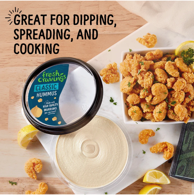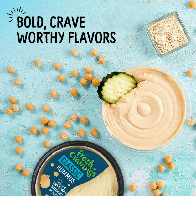 Indulge in Fresh Cravings Classic Hummus, Single 10 oz Tub. This gluten-free, vegan hummus is made with roasted chickpeas, Chilean Extra Virgin Olive Oil, tahini, and spices blended to perfection for a smooth finish. Ideal for snacking, cooking, and sharing with family and friends. Dip into the recyclable plastic tub with your favorite veggies or use as an ingredient in recipes. So good you'll be coming back for more.