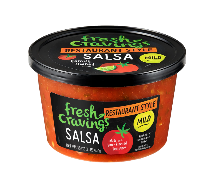 Fresh Cravings Fresh Produce, Refrigerated Mild and Restaurant Style Salsa, 16 oz Tub. Give your meals a tasty twist with Fresh Cravings Mild Restaurant Style Salsa. Made with vine-ripened tomatoes, this salsa has a mild heat level and authentic homemade taste. Use this tasty salsa to top tacos, scoop up with tortilla chips, add to an egg scramble, or use as a zesty salad dressing. Make Taco Tuesday (or any day!) unforgettable with Fresh Cravings Mild Restaurant Style Salsa. Please keep refrigerated. Allergen Statement: Contains Vegetables. Gluten-Free.