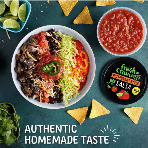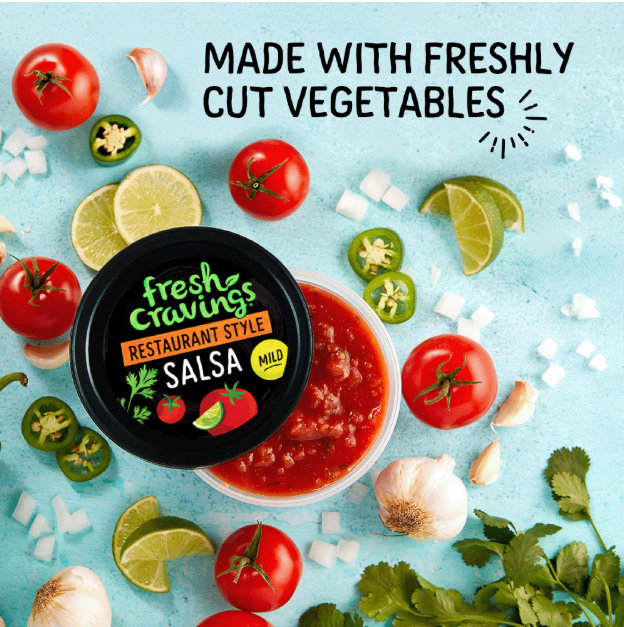 Fresh Cravings Fresh Produce, Refrigerated Mild and Restaurant Style Salsa, 16 oz Tub. Give your meals a tasty twist with Fresh Cravings Mild Restaurant Style Salsa. Made with vine-ripened tomatoes, this salsa has a mild heat level and authentic homemade taste. Use this tasty salsa to top tacos, scoop up with tortilla chips, add to an egg scramble, or use as a zesty salad dressing. Make Taco Tuesday (or any day!) unforgettable with Fresh Cravings Mild Restaurant Style Salsa. Please keep refrigerated. Allergen Statement: Contains Vegetables. Gluten-Free.