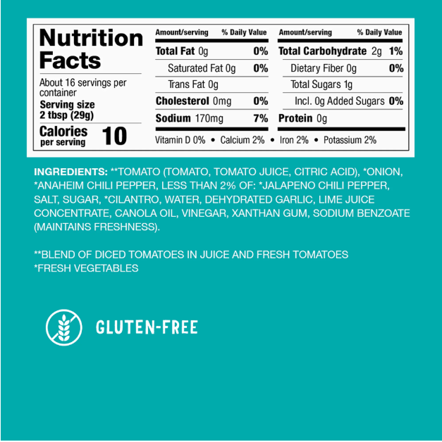Tomato (Tomato, Tomato Juice, Citric Acid, Calcium Chloride), *Onion, *Anaheim Chili Pepper, *Cilantro, *Jalapeno Chili Pepper, Salt, Sugar, Less than 1% of: Water, Dehydrated Garlic, Lime Juice Concentrate, White Distilled Vinegar, Canola Oil, Sodium Benzoate (maintains freshness), Xanthan Gum, **Blend of Diced Tomatoes in Juice and Fresh Tomatoes, *Fresh Vegetables