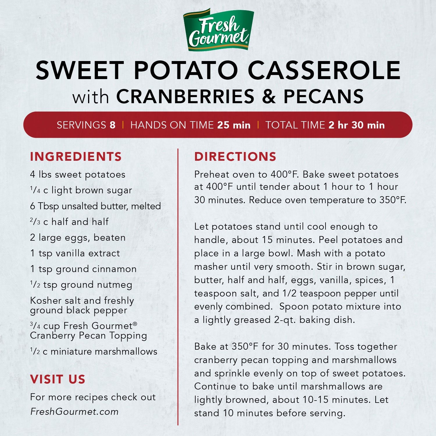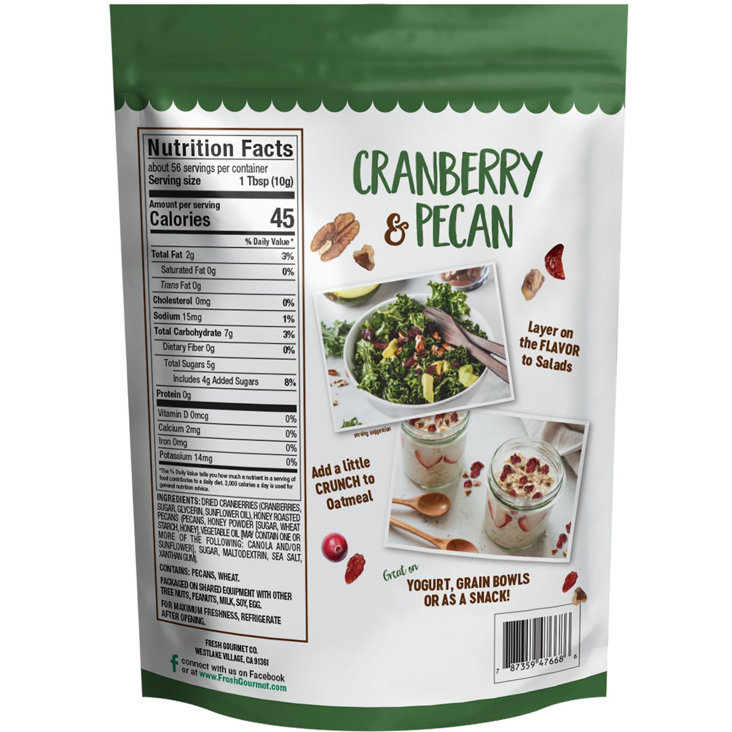 Fresh Gourmet (20. oz) Cranberry and Pecan is a delicious mix of Dried and Sweet Cranberries with Honey Roasted Pecans. Fresh Gourmet sets the pace with today's trends as food toppings experts, offering busy cooks the crunch, flavor, and texture that transform everyday dishes into memorable meals in minutes. Long known for the innovative approach, the Fresh Gourmet brand offers the most extensive variety of salad toppings available on the market today.