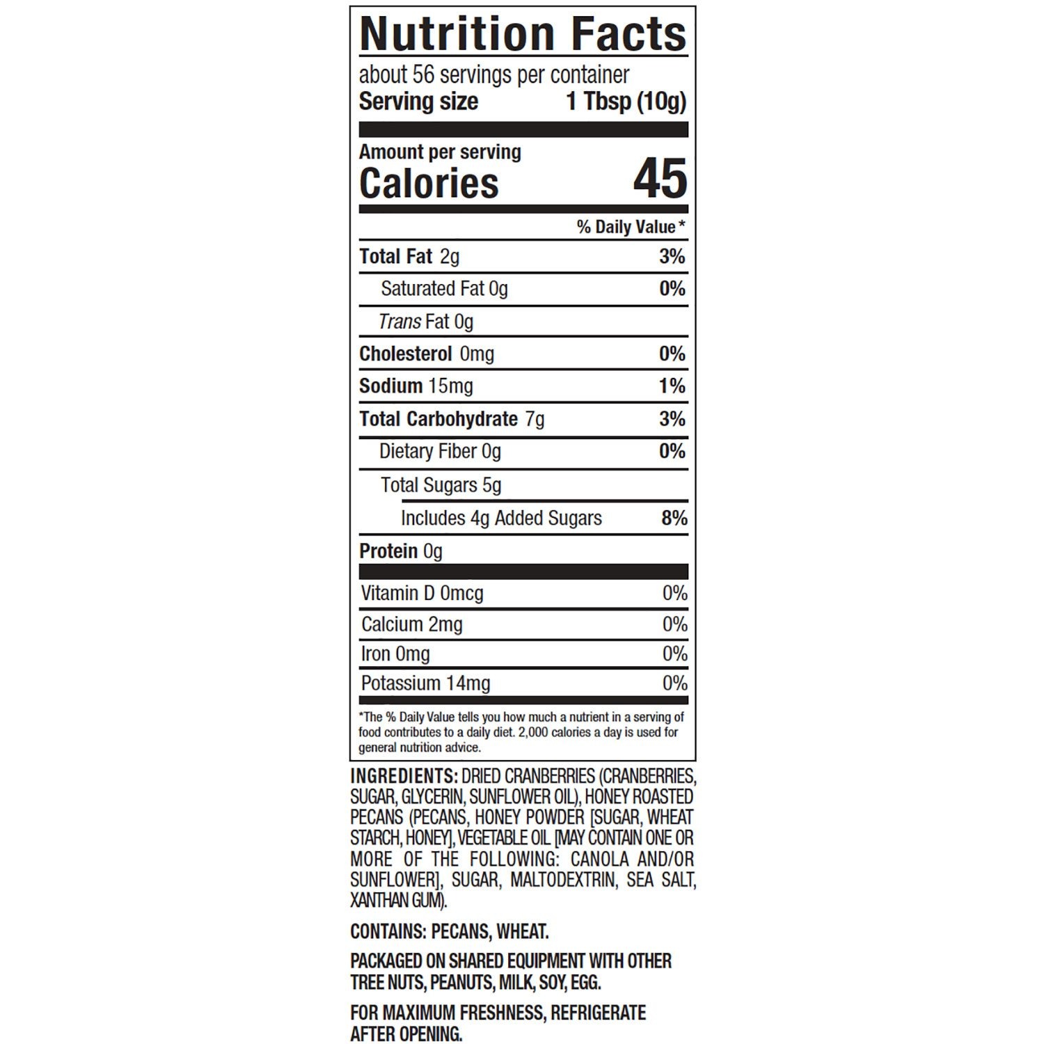 Ingredients: dried cranberries (cranberries, sugar, glycerin, sunflower oil), honey roasted pecans (pecans, honey powder [sugar, wheat starch, honey, vegetable oil [may contain one or more of the following: canola and/or sunflower], sugar, maltodextrin, sea salt, xanthan gum