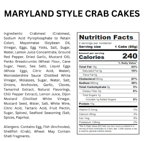 Fresh Maryland Style Crab Cakes, 6 oz. Oven-Safe Tray. 10g Protein per 1 Cake Serving. Silicone-Free