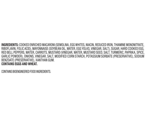 Cooked Enriched Macaroni (Semolina, Egg Whites, Niacin, Reduced Iron, Thiamine Mononitrate, Riboflavin, Folic Acid), Mayonnaise (Soybean Oil, Water, Egg Yolks, Vinegar, Salt), Sugar, Hard Cooked Egg, Red Bell Peppers, Water, Carrots, Mustard (Vinegar, Water, Mustard Seed, Salt, Turmeric, Paprika, Spice, Garlic Powder), Onions, Vinegar, Salt, Modified Corn Starch, Potassium Sorbate (Preservative), Sodium Benzoate (Preservative), Xanthan Gum.