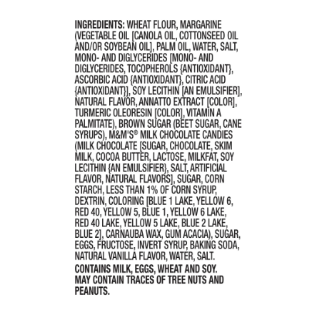 WHEAT FLOUR, MARGARINE(VEGETABLE OIL[CANOLA OIL, COTTONSEED OIL AND/OR SOYBEAN OIL], PALM OIL, WATER, SALT, MONO- AND DIGLYCERIDES[MONO- AND DIGLYCERIDES, TOCOPHEROLS{ANTIOXIDANT}, ASCORBIC ACID{ANTIOXIDANT}, CITRIC ACID{ANTIOXIDANT}], SOY LECITHIN [AN EMULSIFIER], NATURAL FLAVOR, ANNATTO EXTRACT[COLOR], TURMERIC OLEORESIN [COLOR], VITAMIN A PALMITATE), BROWN SUGAR(BEET SUGAR, CANE SYRUPS), M&M'S® MILK CHOCOLATE CANDIES(MILK CHOCOLATE[SUGAR, CHOCOLATE, SKIM MILK, COCOA BUTTER, LACTOSE, MILK FAT, SOY LECITHIN {AN EMULSIFIER}, SALT, ARTIFICIAL FLAVOR, NATURAL FLAVORS], SUGAR, CORN STARCH, LESS THAN 1% OF CORN SYRUP, DEXTRIN, COLORING[BLUE 1 LAKE, YELLOW 6, RED 40, YELLOW 5, BLUE 1, YELLOW 6 LAKE, RED 40 LAKE, YELLOW 5 LAKE, BLUE 2 LAKE, BLUE 2], CARNAUBA WAX, GUM ACACIA), SUGAR, EGGS, FRUCTOSE, INVERT SYRUP, BAKING SODA, NATURAL VANILLA FLAVOR, WATER, SALT. CONTAINS MILK, EGGS, WHEAT AND SOY. MAY CONTAIN TRACES OF TREE NUTS AND PEANUTS.