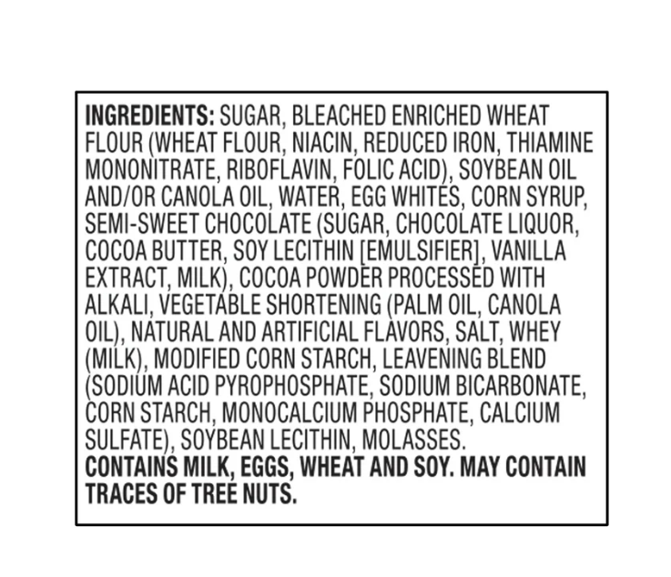 SUGAR, BLEACHED ENRICHED WHEAT FLOUR (WHEAT FLOUR, NIACIN, REDUCED IRON, THIAMINE MONONITRATE, RIBOFLAVIN, FOLIC ACID), SOYBEAN OIL, WATER, EGG WHITE, CORN SYRUP, SEMI-SWEET CHOCOLATE (SUGAR, CHOCOLATE LIQUOR, COCOA BUTTER, SOY LECITHIN, VANILLA EXTRACT), COCOA (PROCESSED WITH ALKALI), VEGETABLE SHORTENING (PALM OIL, CANOLA OIL, MODIFIED PALM OIL), SALT, ARTIFICIAL VANILLA FLAVOR NATURAL CHOCOLATE FLAVOR, WHEY, MODIFIED CORNSTARCH, BAKING POWDER (SODIUM ACID PYROPHOSPHATE, SODIUM BICARBONATE, CORNSTARCH, MONOCALCIUM PHOSPHATE, CALCIUM SULFATE), SOYBEAN LECITHIN, MOLASSES.